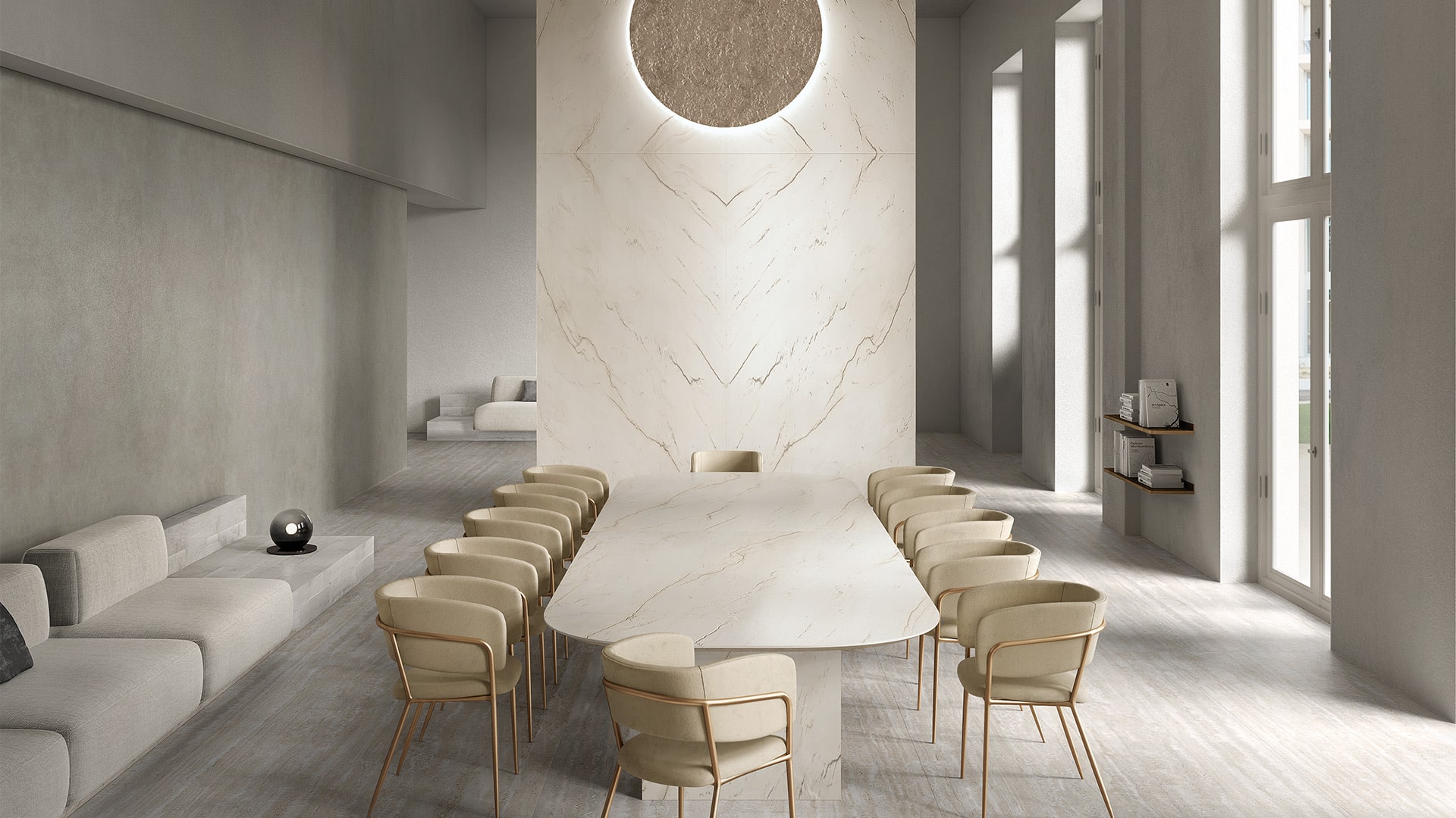 Etkileyici Doğal Görünüm: Calacatta mermerinden ilham alan eşsiz damar yapısı, mekanlara prestijli bir hava katar.
