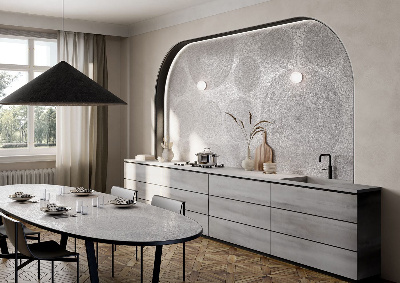 Infinity Holos Hyams White, beyazın farklı tonlarını ve zarif geometrik desenlerini bir araya getirerek mekânlarınıza sofistike bir atmosfer kazandıran benzersiz bir yüzey tasarımıdır. Bu özel tasarım, iç ve dış mekânlarda modern ve şık bir görünüm sunar.