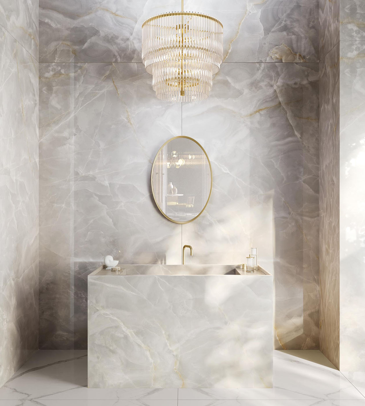 Doğal ve Zarif Estetik: Onyx White’ın kristal beyaz tonu ve zarif damarları, iç mekânlarda aydınlık ve şık bir atmosfer oluşturur.